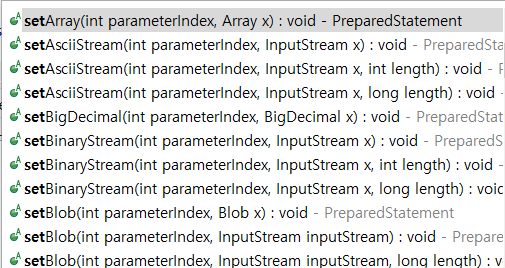예시) 첫 번째 ?를 숫자형 100으로 변경하고 싶으면 setInt(1, 100) 형식으로 작성하면 된다.